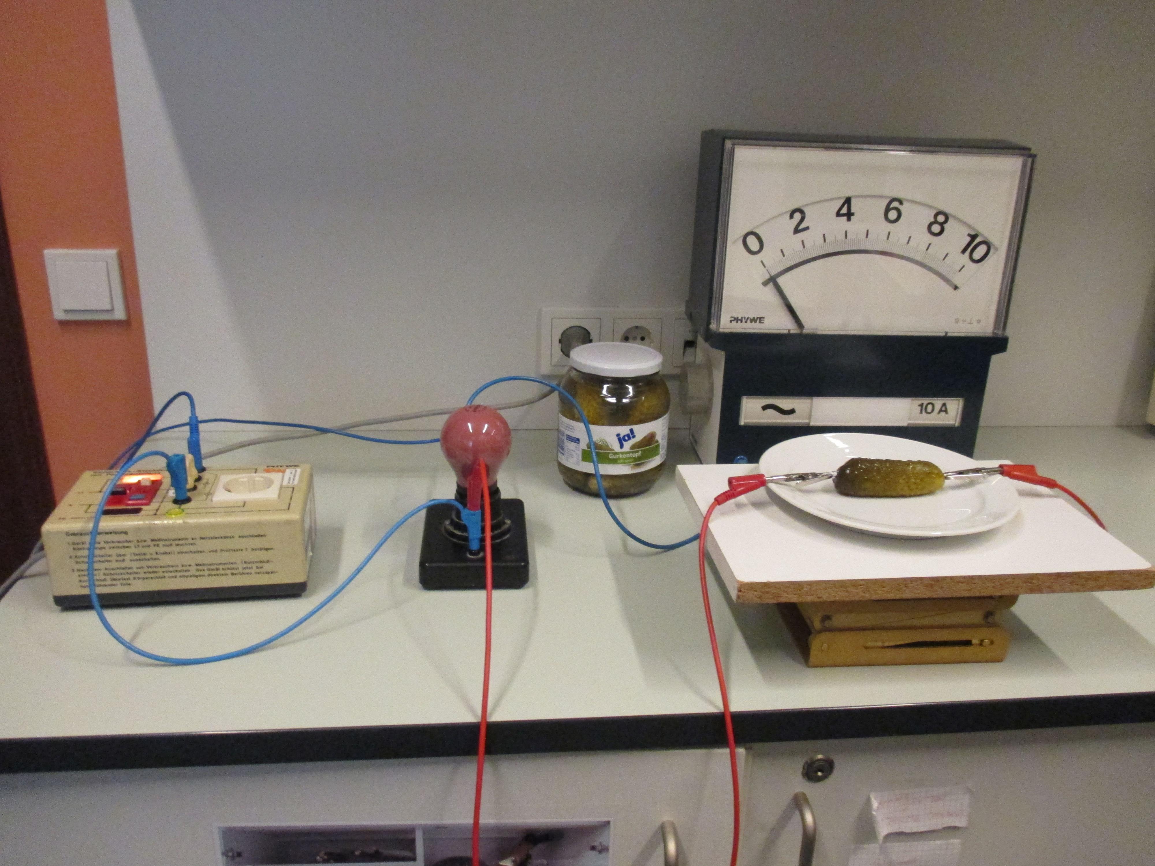 Gewürzgurke an Krokodilklemmen