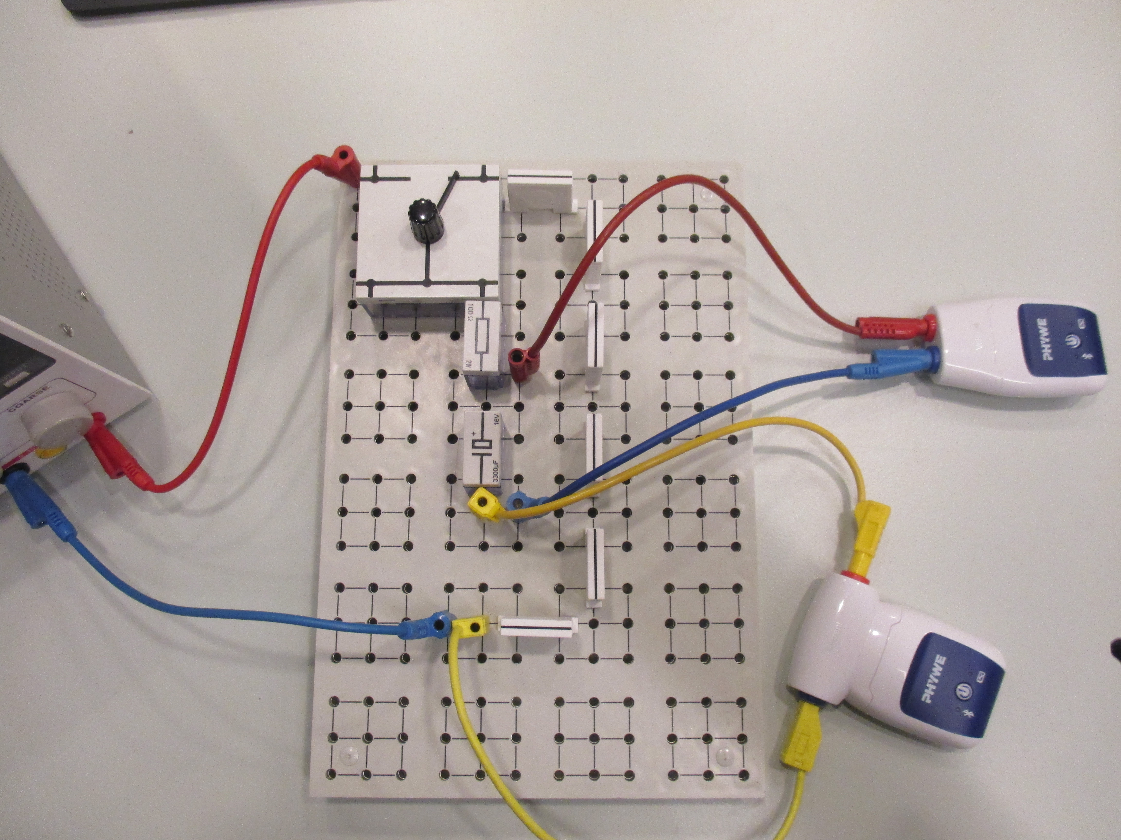 Steckbrett mit Wechselschalter, Kondensator (3300µF), Widerstand (10kOhm).