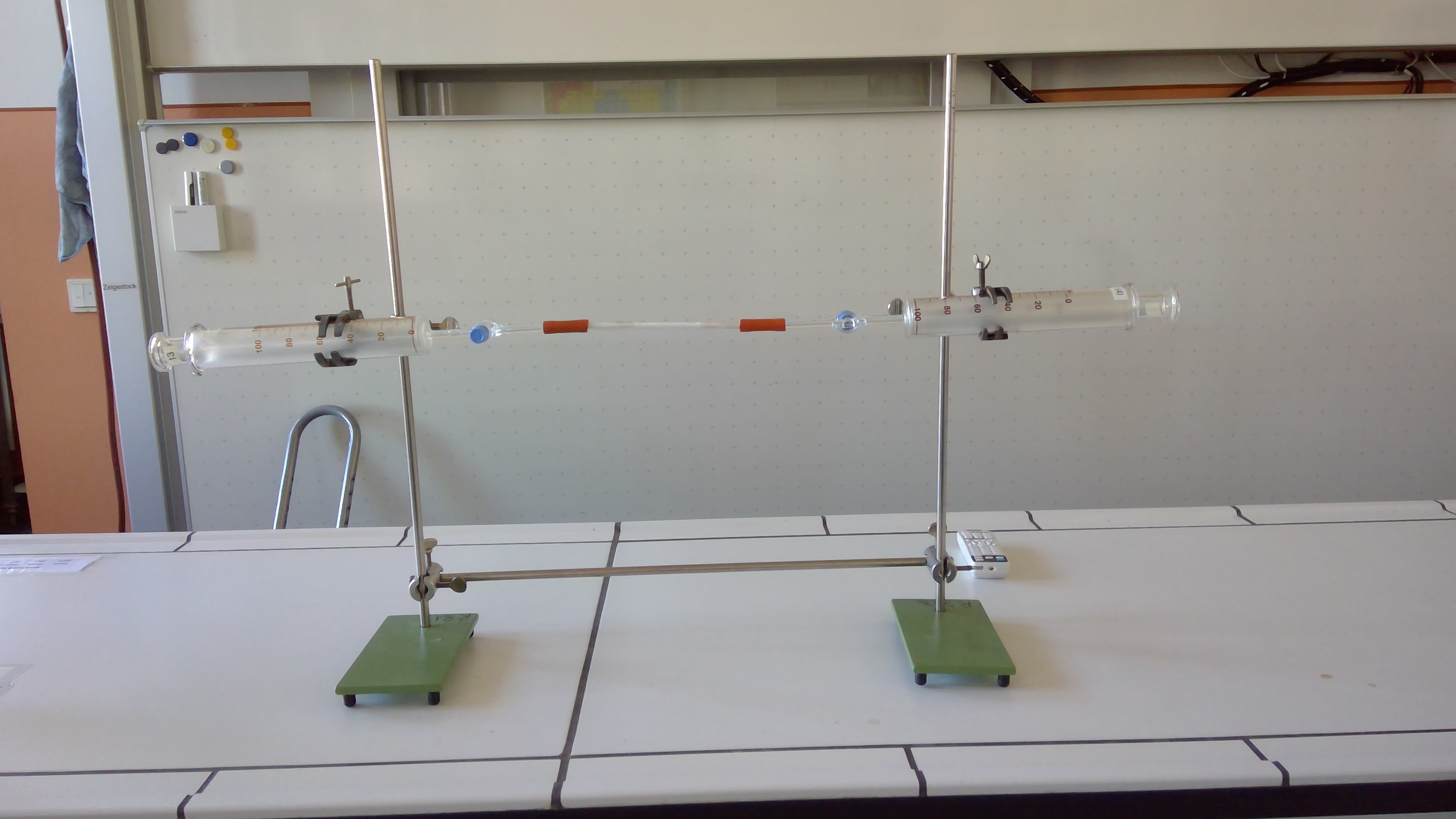 Aufbau: Nach Foto. Kaliumhydroxid frisch verwenden, fein mörsern und mittig in das Glasrohr füllen. Dabei auf beiden Seiten mit Glaswolle gegen Verschieben sichern. An den Enden des Glasrohrs kann Wasser nachgewiesen werden, wenn man etwas Platz lässt. CO2 in einen der beiden Kolben füllen.