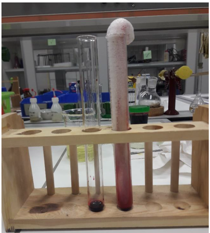 Zuerst werden 5ml Schweineblut in ein Becherglas überführt. Nun fügt man 10ml einer 3prozentigen Wasserstoffperoxidlösung in das Becherglas mit dem Schweineblut hinzu.