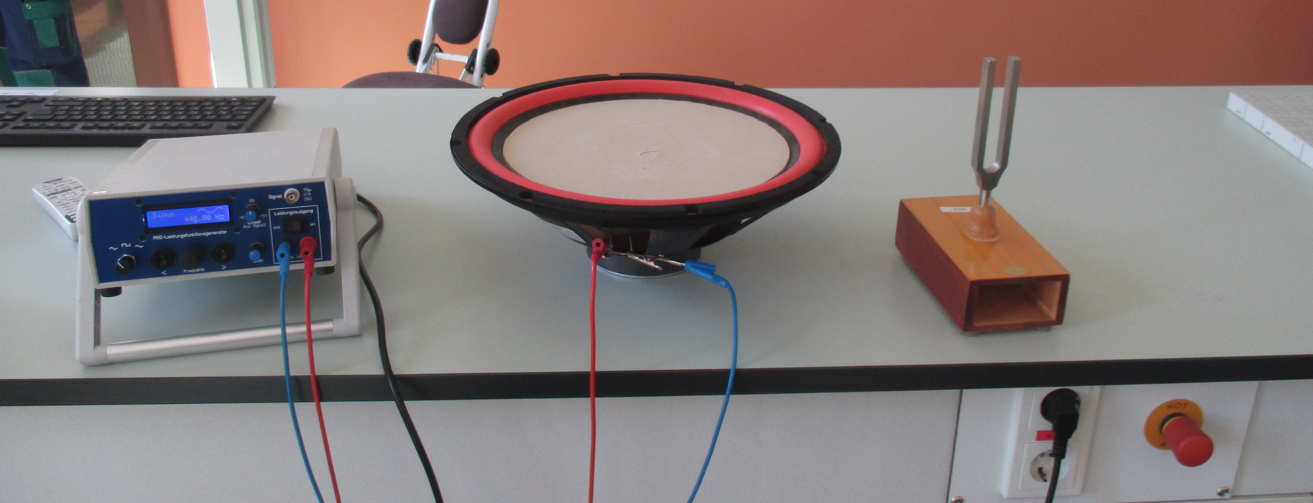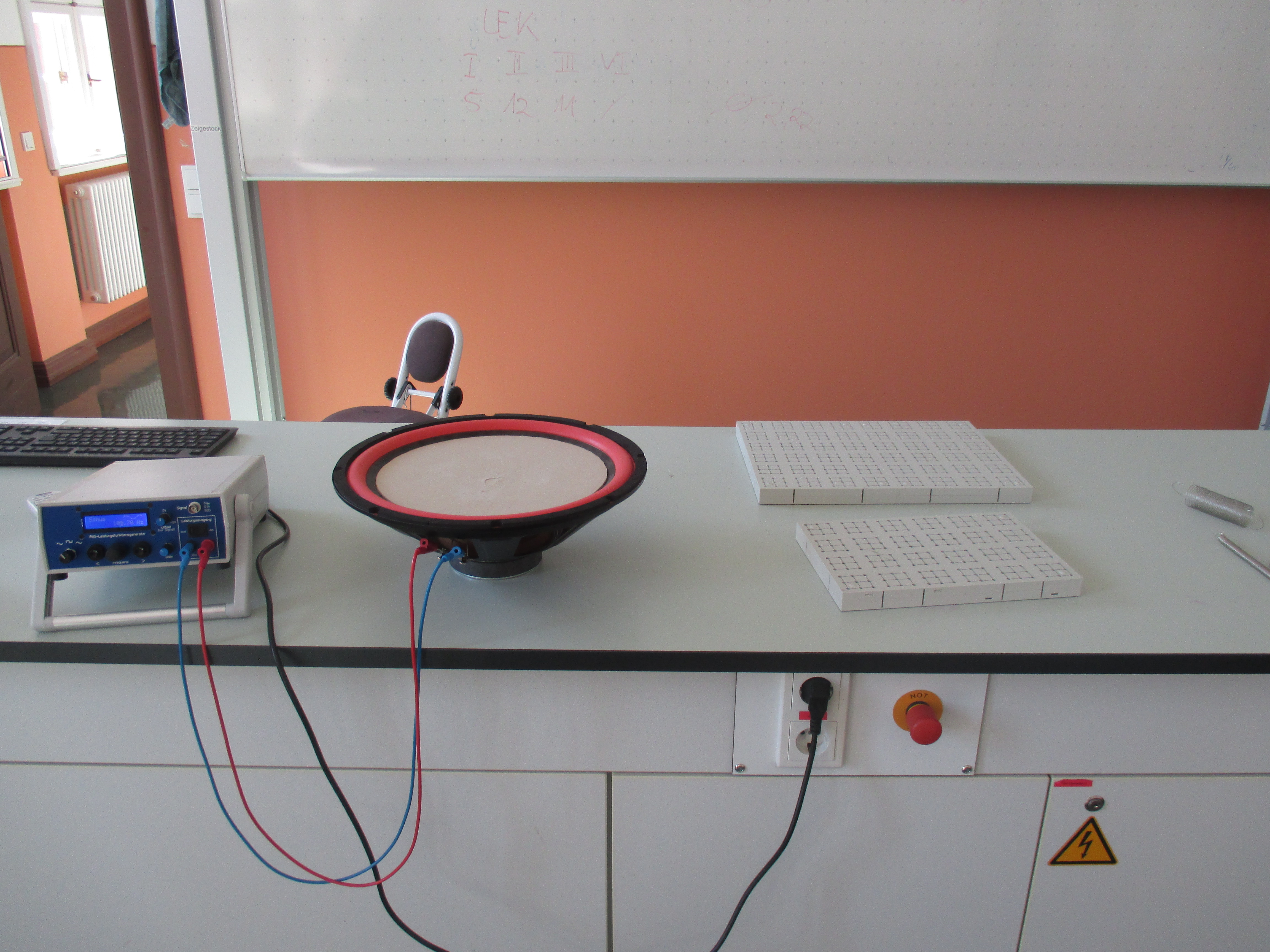 Mit dem Lautsprecher kann die Stimmgabel angeregt werden, aber auch die Steckbretter zum klappern.