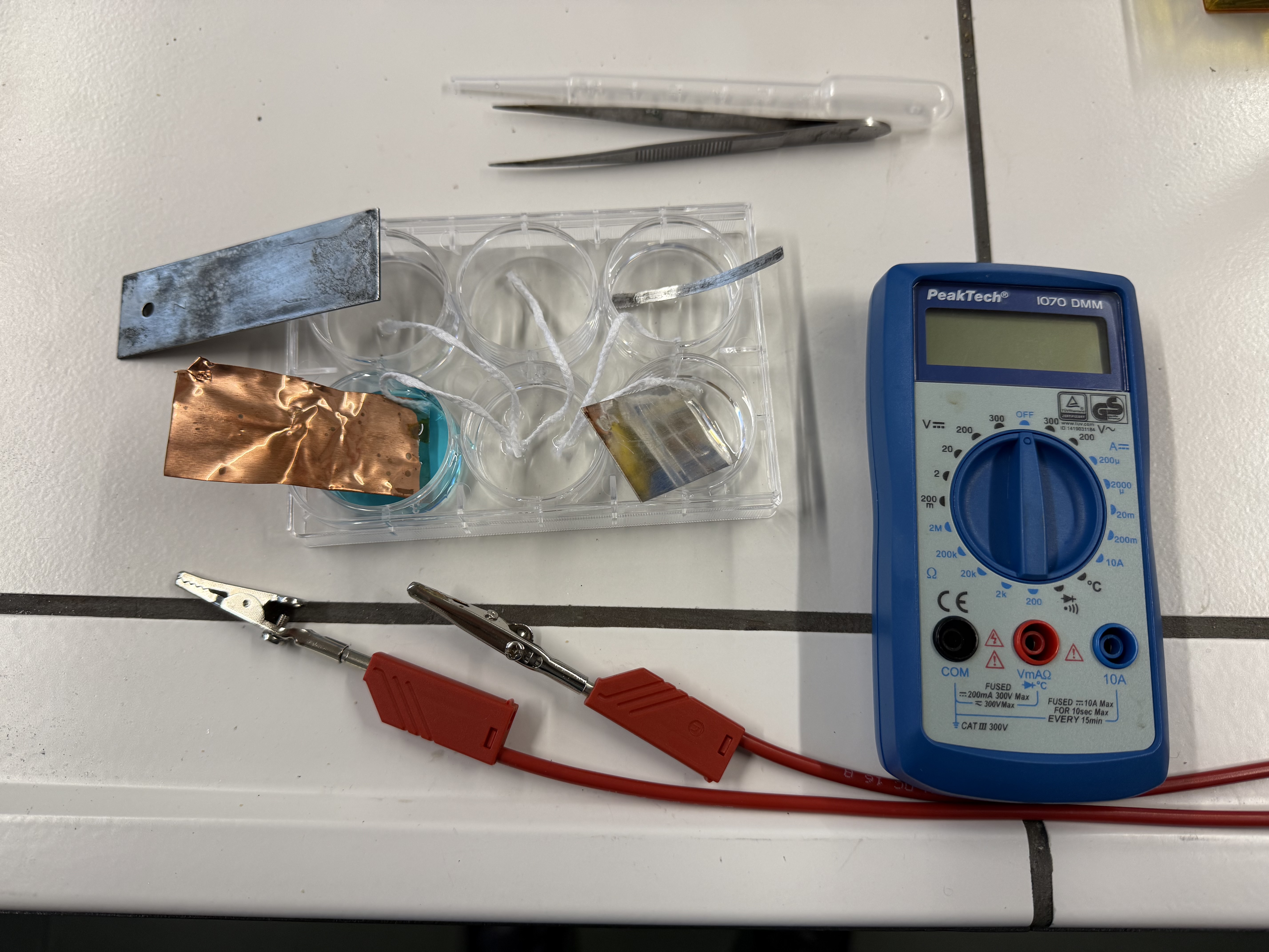 6-Well-Platten, 2 Kabel, 2 Krokodilklemmen, Spannungsmessgerät, Kerzendocht (Filterpapier o. ä. geht auch)