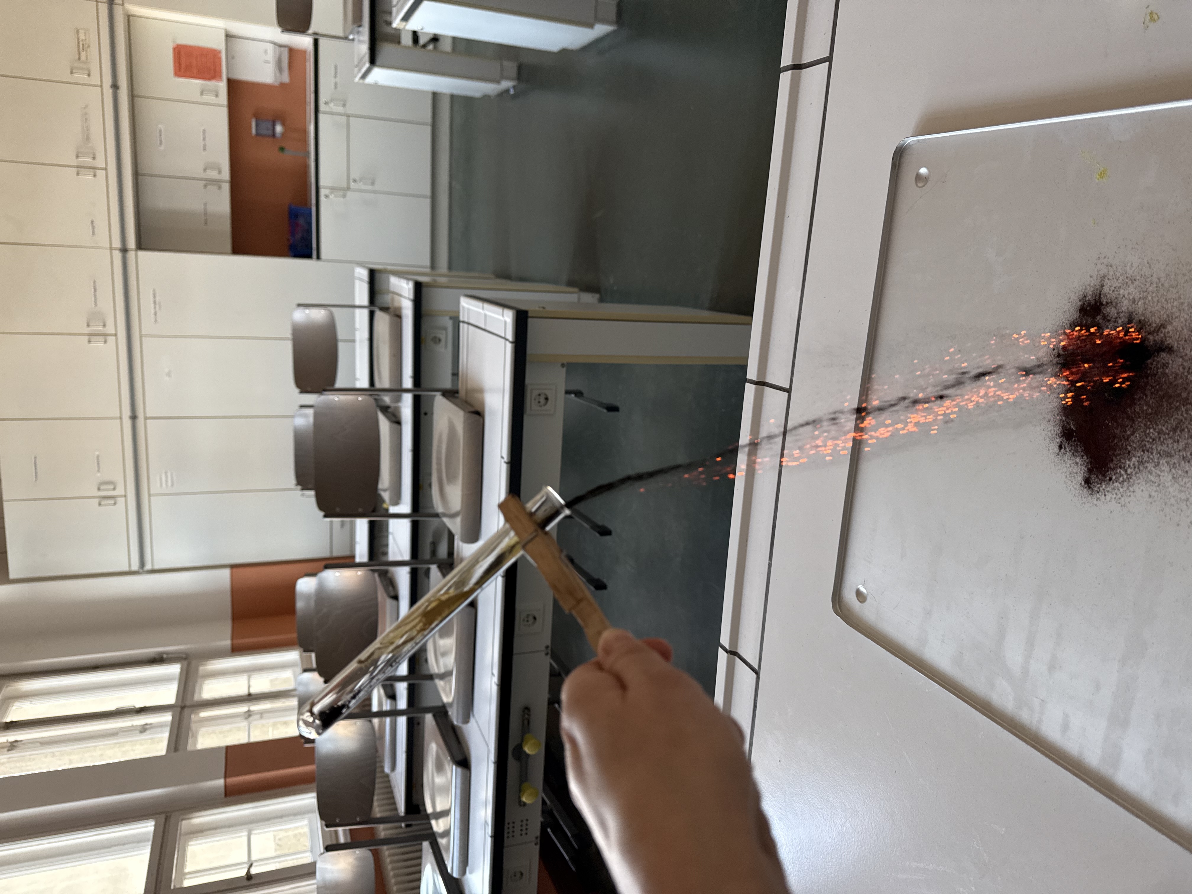 LV pyrophores Eisen: 1 cm hoch Eisen(II)-oxalat-Dihydrat in Reagenzglas geben, mit Wattebausch verschließen, erhitzen bis zur Farbänderung von gelb zu schwarz. Kondenswasser vorsichtig durch Erhitzen entfernen. Wattebausch entfernen und aus 50 cm Höhe auf feuerfeste Unterlage schütten (Raum abdunkeln).