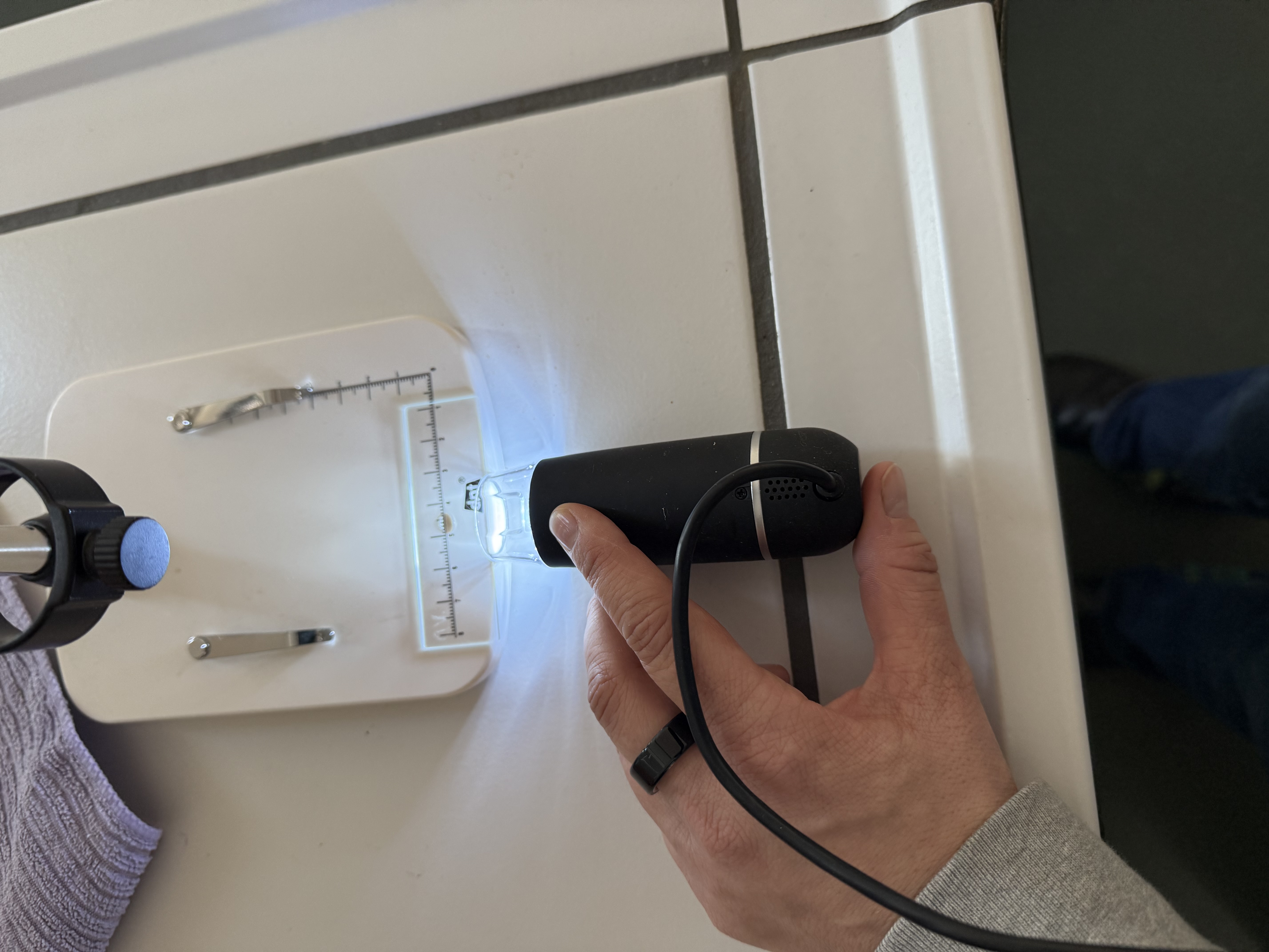 Pasteurpipetten, Schleifpapier, Pinzette, Bechergläser, Messzylinder, Feinwaage, Wägeschälchen, Spatel; USB-Mikroskop-Kamera