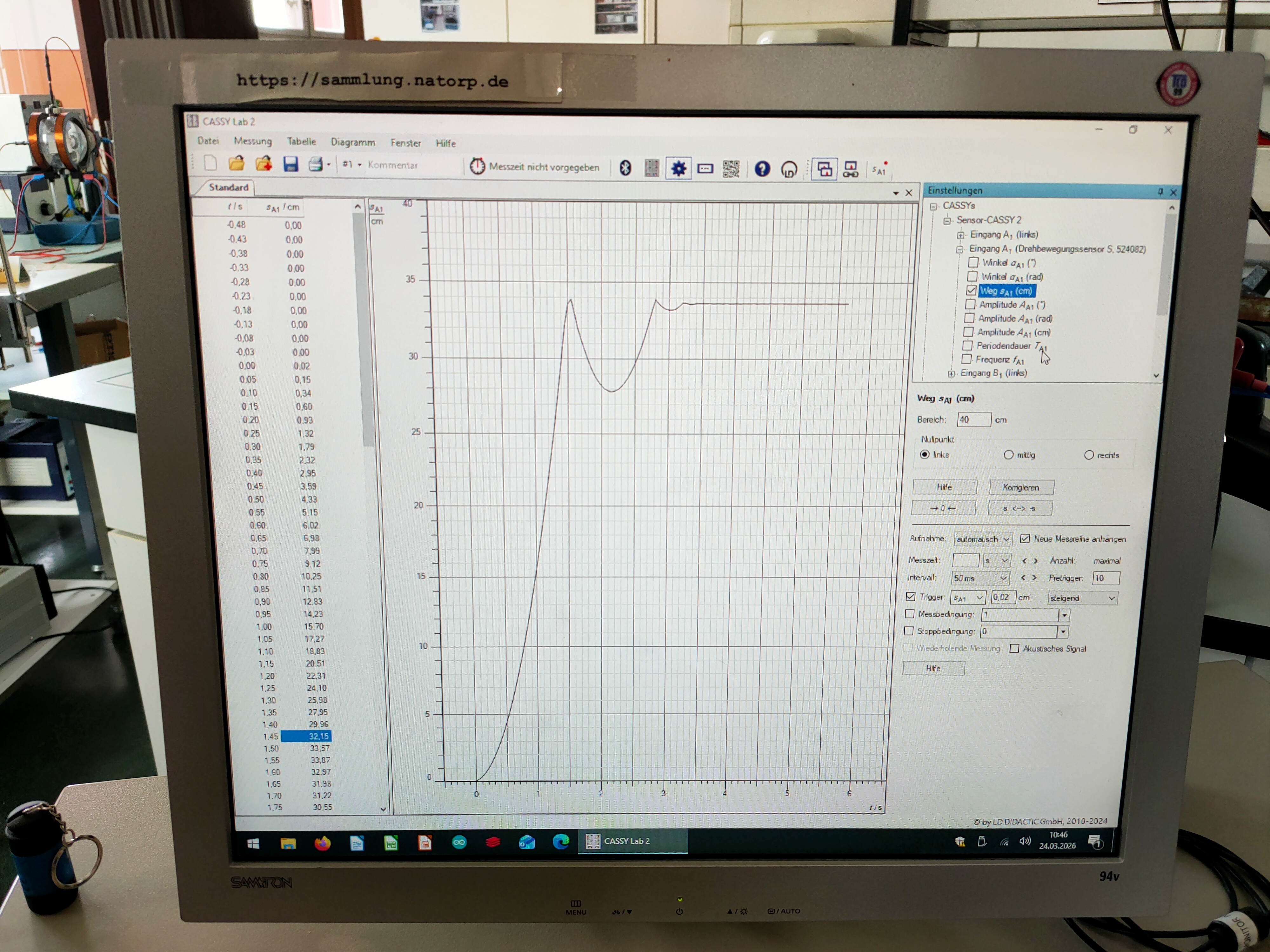 Andere Massekombinationen auch möglich. Start der Messung mit Trigger (s = 0,02cm) empfohlen. Pretrigger auf 10 setzen.